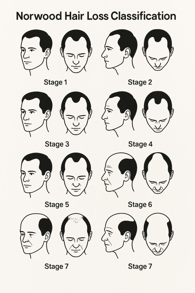 Hamilton-Norwood-Skala zeigt zwar nicht jede individuelle Mischform des Haarausfalls, bietet aber ein klares Schema für den typischen Verlauf der androgenetischen Alopezie bei Männern. Sie dient als Grundlage für die medizinische Dokumentation und ist in der modernen Haarchirurgie ein fester Bestandteil des klinischen Alltags.